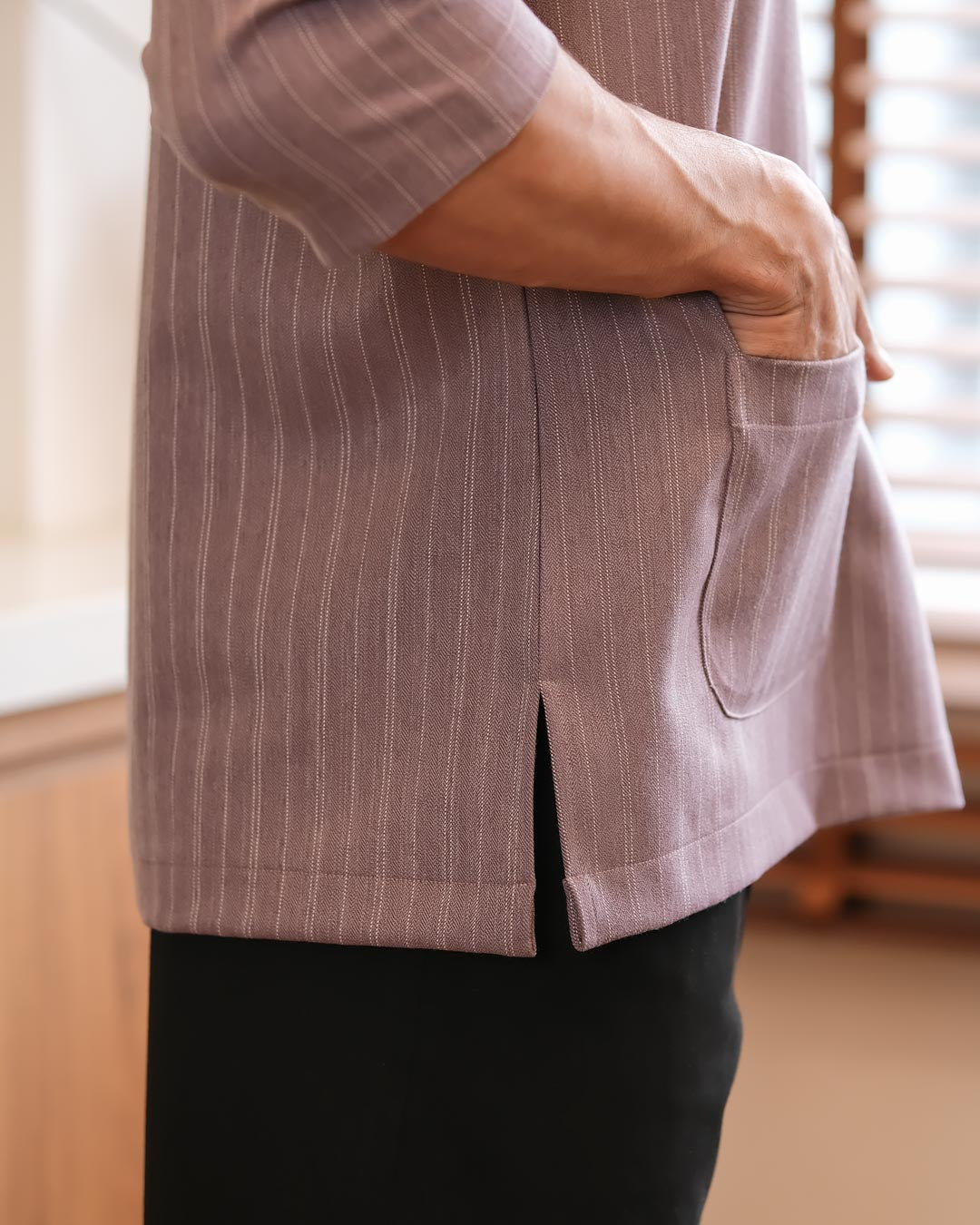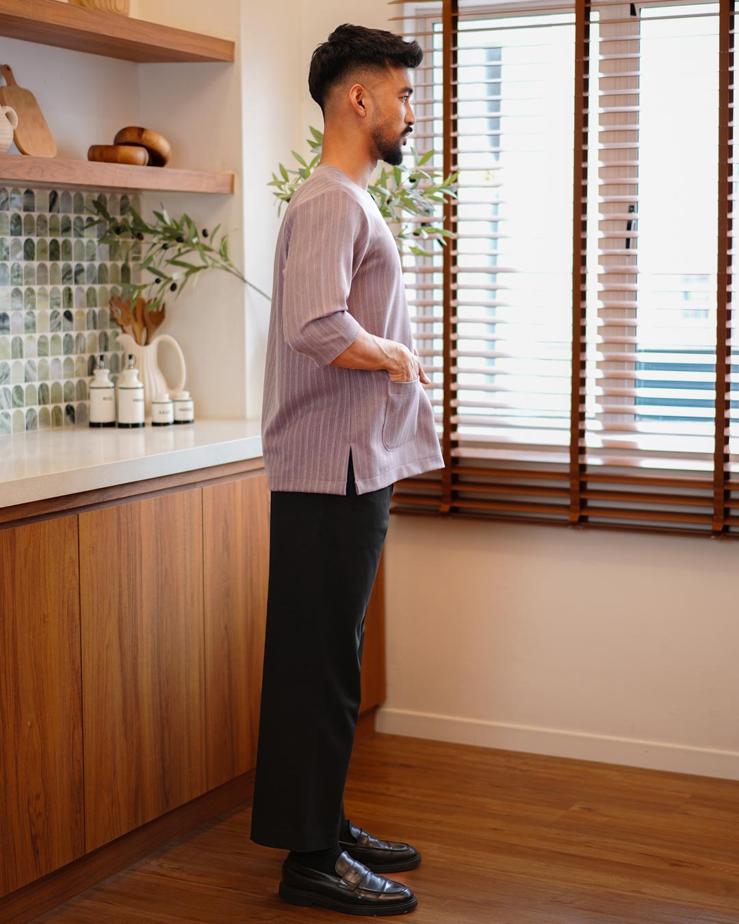 Kurta Jalin, simple yet full of character. Crafted from premium soft material with fine line textures, cool and comfortable all day long. Relaxed fit with a front pocket, ¾ sleeves, round neck collar, and side slits. Unisex, easy to wear, and totally iron-free.