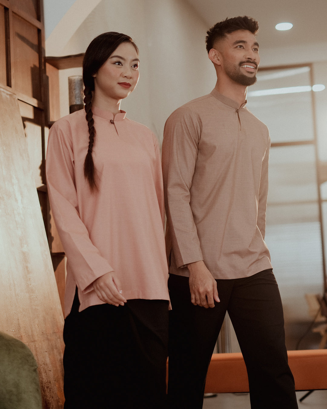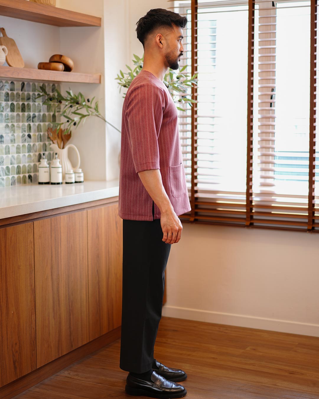 Kurta Jalin, simple yet full of character. Crafted from premium soft material with fine line textures, cool and comfortable all day long. Relaxed fit with a front pocket, ¾ sleeves, round neck collar, and side slits. Unisex, easy to wear, and totally iron-free.