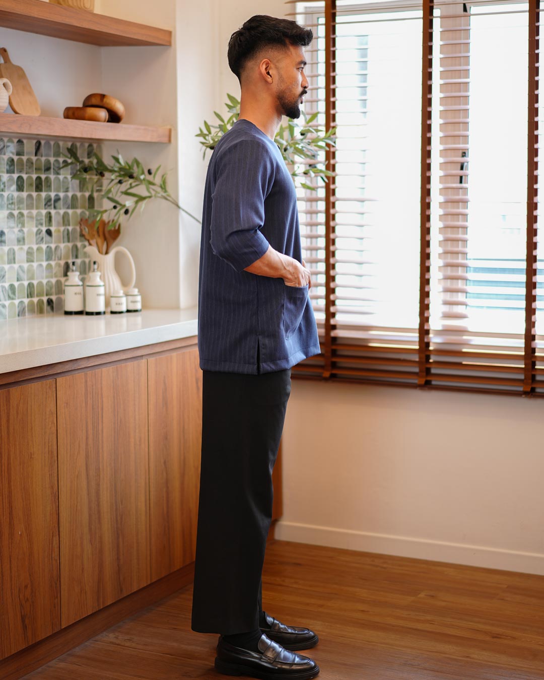 Kurta Jalin, simple yet full of character. Crafted from premium soft material with fine line textures, cool and comfortable all day long. Relaxed fit with a front pocket, ¾ sleeves, round neck collar, and side slits. Unisex, easy to wear, and totally iron-free.